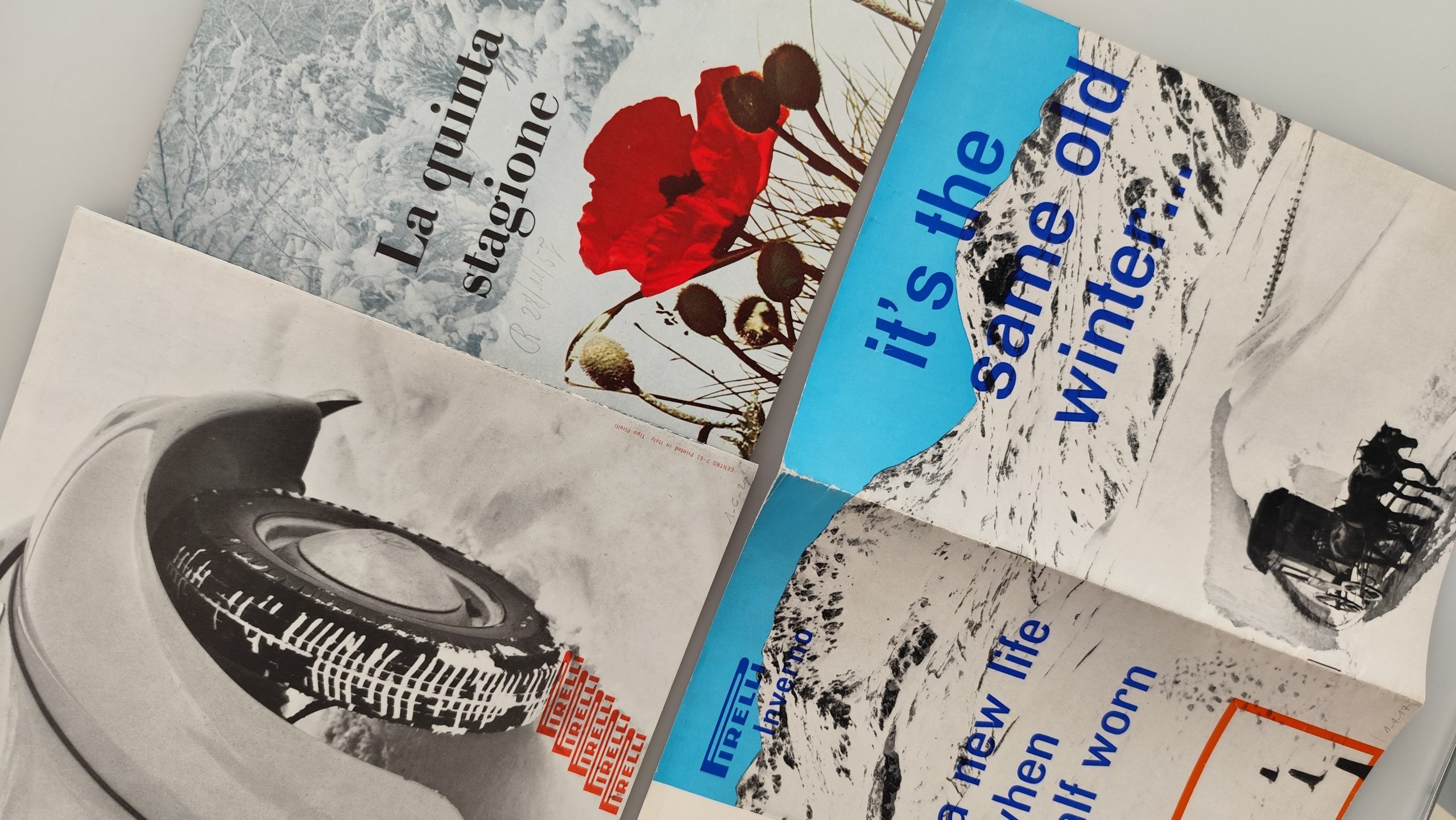Pirelli’s first winter tyre with a herringbone tread was the Inverno, which came out in 1951, based on the 1930s Artiglio tyre. In the years that followed, leading figures in advertising and design – Bob Noorda, Ezio Bonini and Franco Grignani – were called in to promote it. “Senza catene per l’inverno” (“Winter without Chains”) is the tagline in Noorda’s advertisement published in Pirelli magazine no. 6 of 1952, summing up the benefit offered by the Inverno. Bonini took up the theme in his 1952/3 campaign “Per l’inverno il pneumatico Inverno” “For winter, the winter tyre”, declaring: “Safe on slippery, wet roads, on smooth, compacted snow, without the loss of power caused by chains.” In 1955, Grignani added: “Have a good winter journey with Pirelli Inverno”, explaining that it came “… without the bother of chains.”