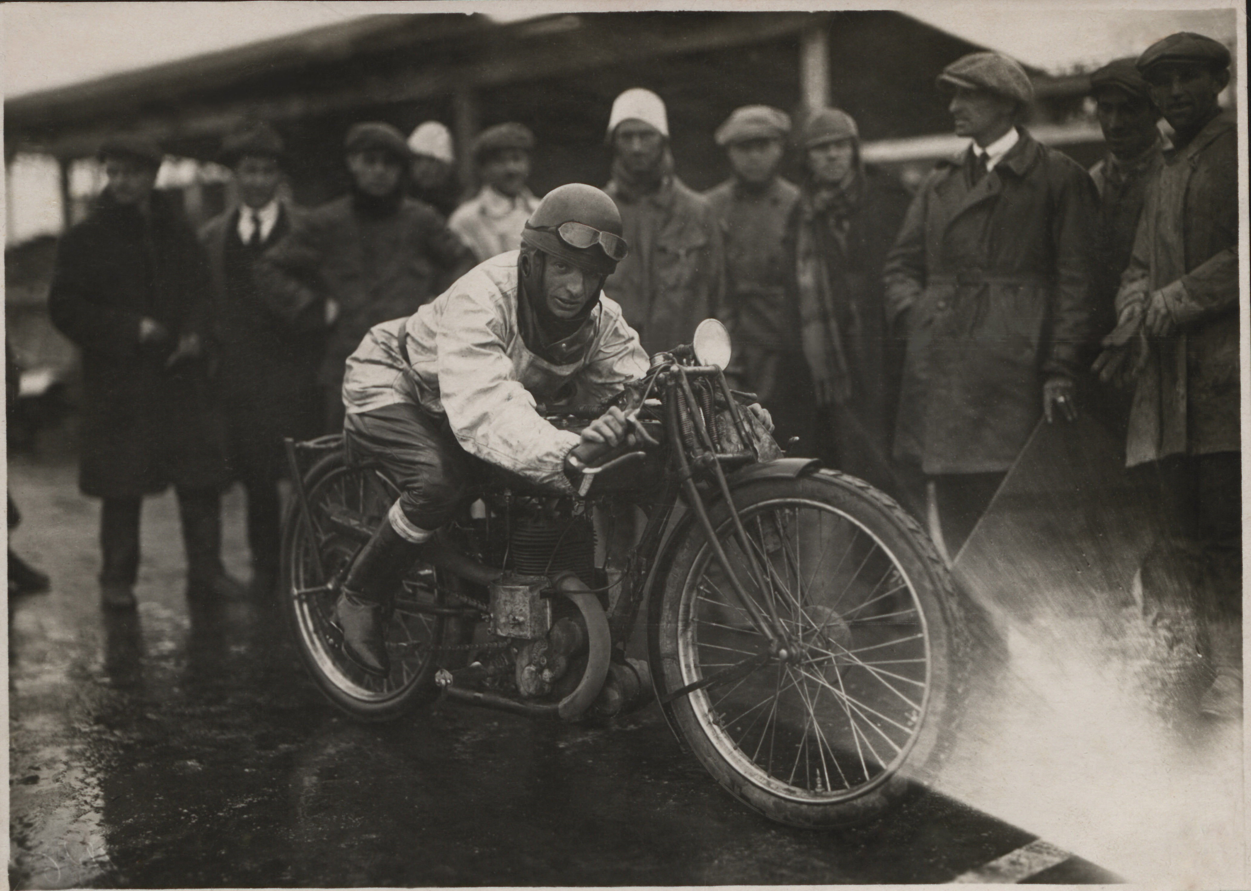 Accanto al sorriso di Visioli, ecco il piglio “da duro” di Miro Maffeis, “il bel Miro” che tanto piaceva alle ragazze. Maffeis conosceva bene gli oltre ottocento chilometri del Raid Nord-Sud, da Milano a Napoli: l’aveva vinto nel 1920, con una Indian 500, e ancora era arrivato terzo nel 1925, con la Bianchi 350, abbastanza per ritagliarsi la fama di trionfatore. E poi c’è naturalmente lui: Tazio Nuvolari, “l’incarnazione del diavolo”, per qualcuno, prima ancora di essere il “mantovano volante”. Nuvolari che scendendo dal valico del Ghisallo, in curva lasciava perdere i freni: per svoltare puntava il gomito – imbottito – contro i muri delle case che fiancheggiavano la strada, usandolo come un perno per cambiare bruscamente direzione e ripartire. Ovviamente davanti a tutti, con la Bianchi 350 Freccia Celeste gommata Pirelli Motocord. In una delle foto è ritratto insieme ai compagni di corsa della squadra Bianchi: tutti in divisa tranne lui, naturalmente. Sguardo fiero e altero quello dell’ingegnere-pilota Piero Taruffi, che nel 1937 con la moto Gilera Rondine da lui stesso carenata per sfruttarne al meglio l’aerodinamicità e dotata di pneumatici Pirelli del tipo “rigato ultraleggero S”, stabilisce un’inimitabile sequenza di record di velocità sull’autostrada tra Bergamo e Brescia.