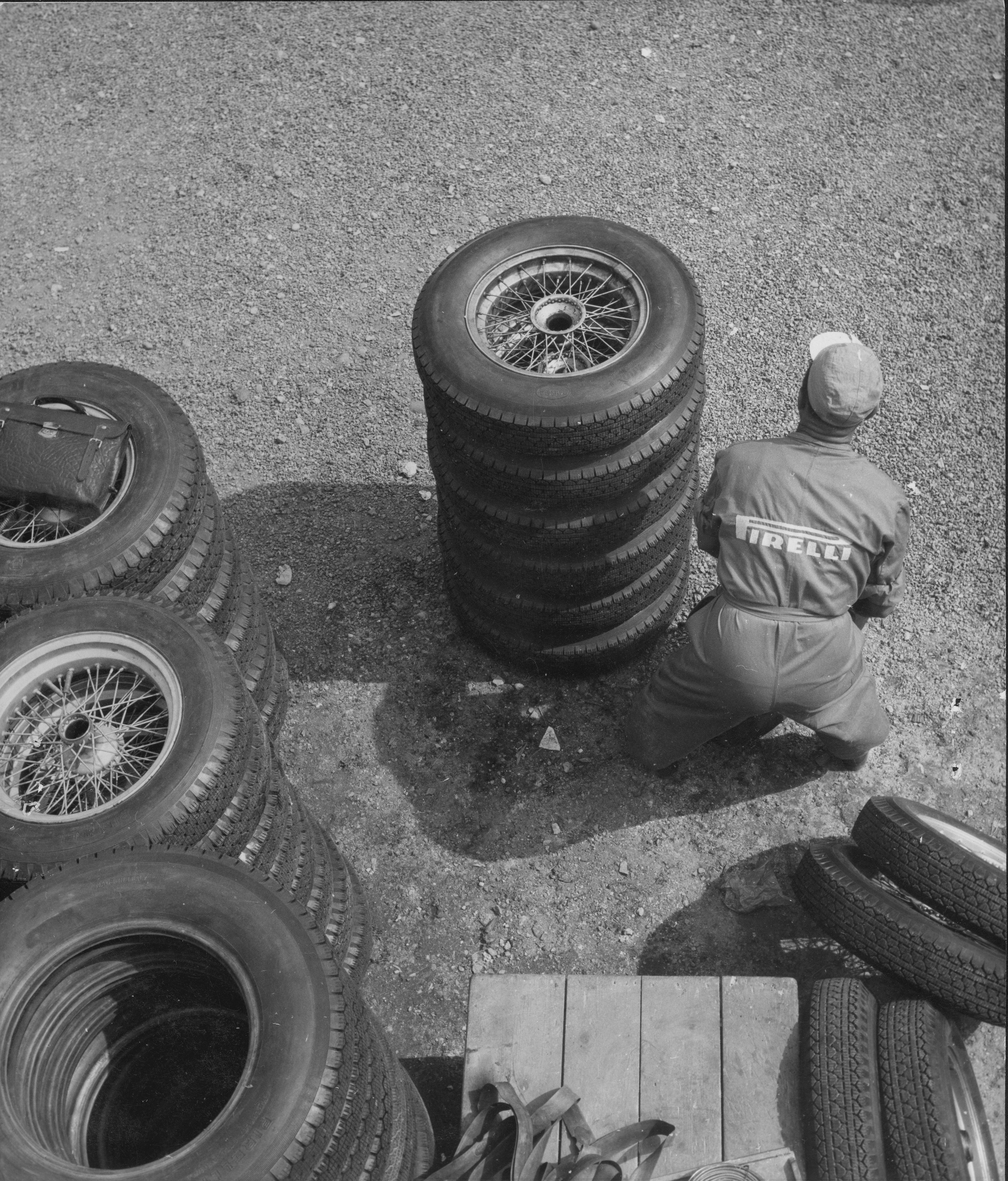 Nel 1950 nasce la Formula 1 e per le competizioni automobilistiche si apre un nuovo capitolo. Continua il sodalizio con Alfa Romeo, che al Gran Premio di Monza del 3 settembre 1950 si aggiudica il primo mondiale della storia della Formula 1 con la Alfa 158 guidata da Nino Farina. Il pneumatico è lo Stella Bianca corsa e sulle ruote si distingue la mano che dal 1939 – anno in cui l’“Italiana Rudge Whitworth” cambia denominazione in “Carlo Borrani” -caratterizza il marchio della ditta. Lo raccontano alcuni scatti del fotografo Federico Patellani, noto per i suoi reportage negli anni della ripresa dopo la guerra, che proprio in quello storico Gran Premio ritrae i meccanici del servizio corse Pirelli ai box mentre controllano e bilanciano le ruote dell’Alfa 158. Se quella con Alfa Romeo e Maserati è una collaborazione storica avviata all’epoca dei Grand Prix d’anteguerra e che prosegue anche negli anni Cinquanta, un marchio nuovo si presenta ora nel mondo delle corse: la Ferrari. Il rapporto di Borrani con Enzo Ferrari ha inizio durante la Coppa Acerbo del 1924, quando il giovane pilota ottiene uno dei migliori risultati della sua carriera sportiva con l’Alfa Romeo equipaggiata con ruote “Rudge Whitworth”. Da allora, per la sua Scuderia Ferrari in Alfa Romeo e in seguito per le auto prodotte con il marchio del cavallino rampante sceglie pneumatici Pirelli e ruote Borrani.