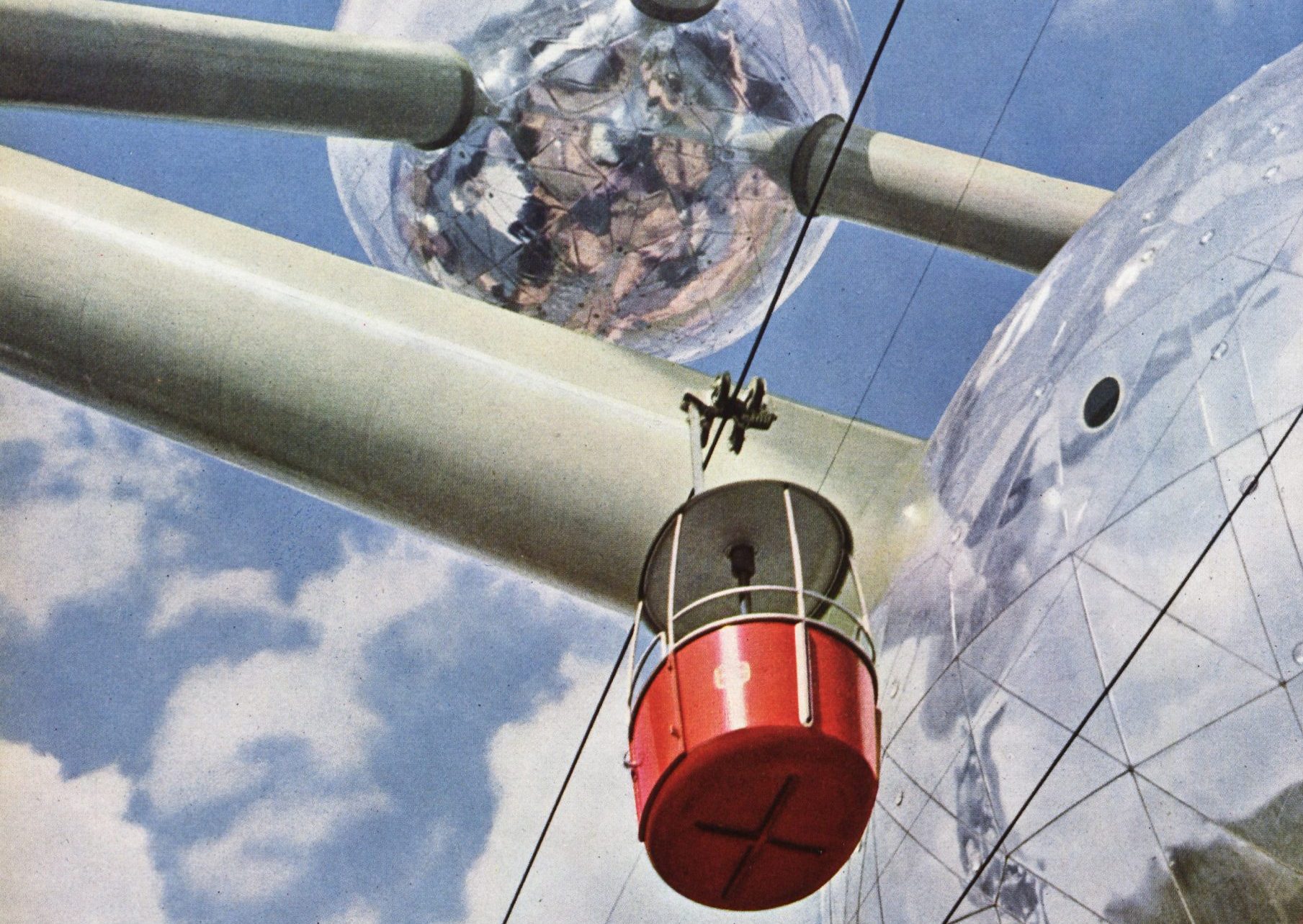 Nel 1958 l’esposizione universale entra nelle pagine della Rivista Pirelli. Nel numero 4 si legge l’articolo “Taccuino dell’Expo” a firma Franco Fellini, pseudonimo di Giovanni Pirelli, dove si descrive lo spirito cosmopolita dell’Esposizione Universale di Bruxelles, con la folla protagonista “una folla internazionale ed eterogenea il cui comune denominatore sembra essere l’ansia di vedere tutto, di tutto sperimentare” e quella dimensione di euforia per le atmosfere fantascientifiche create dall’Atomium, simbolo dell’Expo, e per i grandiosi padiglioni rappresentativi di tutti i mondi allora possibili.
